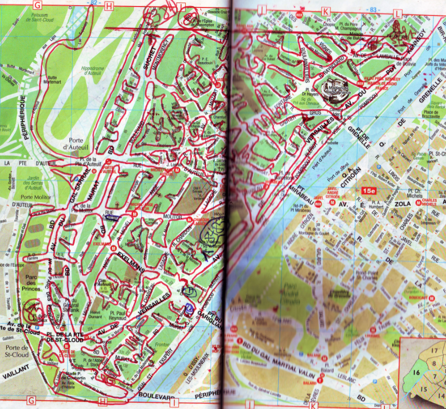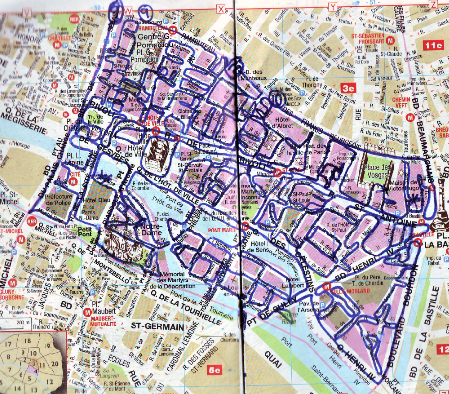 This was a year long project where I walked the entire length of every street in Paris. I took a pocket book map and drew out a line making sure that it eventually traversed every street. I then took the map to the streets and walked, following the line on the map.